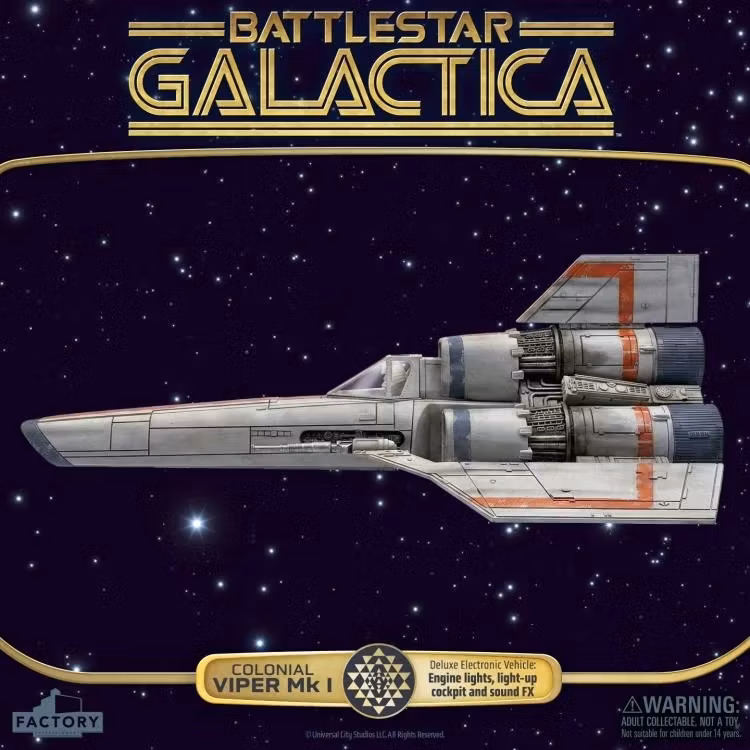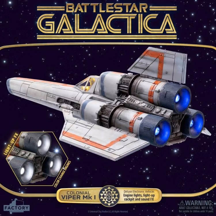 Från den klassiska tv-serien Battlestar Galactica från 1970-talet kommer Colonial Viper Electronic Vehicle, den ikoniska stjärnstridsflygaren i den brokiga kolonialflottan. Skalad för att passa 3,75 actionfigurer väcker detta detaljerade fordon seriens spänning till liv med ljus- och ljudfunktioner som styrs med fjärrkontroll.