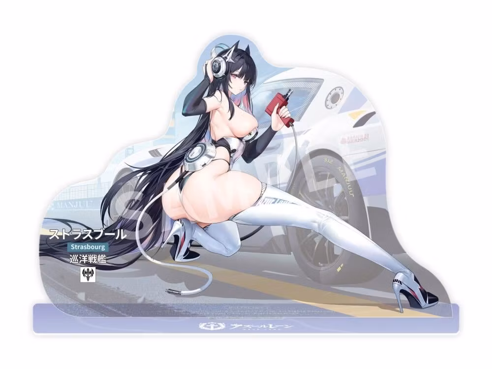 Strasbourg, klädd som en tävlingstjej, går ner på knä och håller i ett gevär och koncentrerar sig på att byta däck på sin racerbil. Hennes långa ben, klädda i vita stövlar, avslöjar hennes imponerande figur. Kostymen använder på ett smart sätt en färgskiftande pärlemorskimrande beläggningsprocess, i kombination med en mycket reflekterande metallisk nyans och kompletterad med flera lager lack, vilket skapar livfulla, livfulla ljus- och skuggeffekter när de belyses från olika vinklar. Dessutom gör det medföljande Smiley Face-ersättningsansiktet att du fritt kan anpassa det efter din befälhavares preferenser, vilket gör att du kan uppleva Strasbourgs olika charm fullt ut.