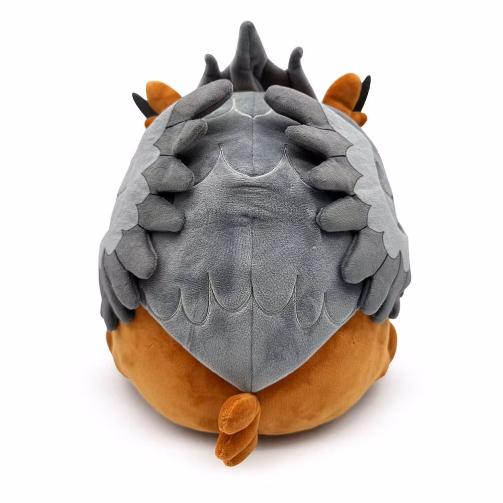 The Owlbear Cub we saved has grown up and is ready to rage! Sitting at 9 inches tall with bright yellow eyes shining above a sharp beak as a light creme face peeks out from under pointed grey armor, a pair of short ears stick out from their head as small arms rest at the front of a huge round body which if covered in feathered armor as curved wings reach out from their shoulders and a small tail raises up from their back. This plush is packed to the seams with 100% PP cotton and is made of normal and long pile minky materials with accents of felt, absolutely perfect for cuddling or backing up your allies with!