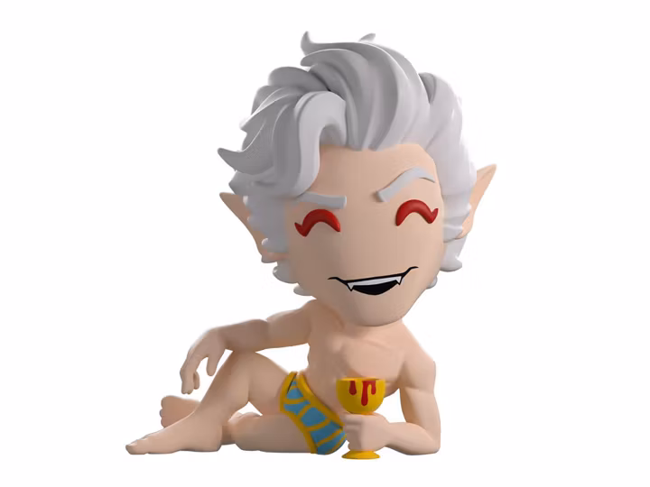 Lying relaxed and devilishly welcoming at 4 inches tall as he holds a golden goblet to his front that has deep red blood spilling over the lip, his fangs poke out from a seductive smirk as he raises an eyebrow over vibrant red eyes. With silver-white hair sweeping to the side effortlessly over pointed ears, he wears nothing but blue and yellow striped shorts, leaving his muscular torso exposed. The exterior of his packaging sees him lounging on an elegant bed, while the interior is covered in floating red petals over a pink background. These then flow onto the protective sleeve, where his figure can be seen through the large, clear window at the packaging's front. This collectible ships in a matte, embossed, protective outer sleeve and a custom-sized plastic protector for maximum protection during shipping.