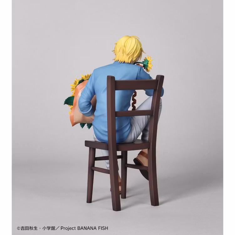 The figure depicts Ash, who is holding a sunflower bouquet and smiling. In line with the image from the original illustration, Ash is winking, and there's a necklace inspired by the letter he received from Eiji, which is draped around his neck. The figure also faithfully reproduces the texture of the ribbon on his wrist, enhancing its overall charm.
