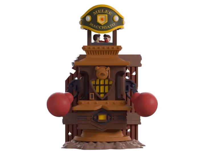 Your weapons aren’t the only things that you should upgrade, so grab a piping-hot brew to power up your fists too! At 5 inches tall and standing in front of a run-down metal wall riddled with bullet holes, a green and gold wrestling belt that says ‘Melee Macchiato' sits at its top above two small figures who are in a boxing match. With its body made of a deluxe brown wood with elegant trimming and a bronze bell at its center above a hatched yellow window, two long mechanical arms extend from its sides and wear a pair of large red boxing gloves.