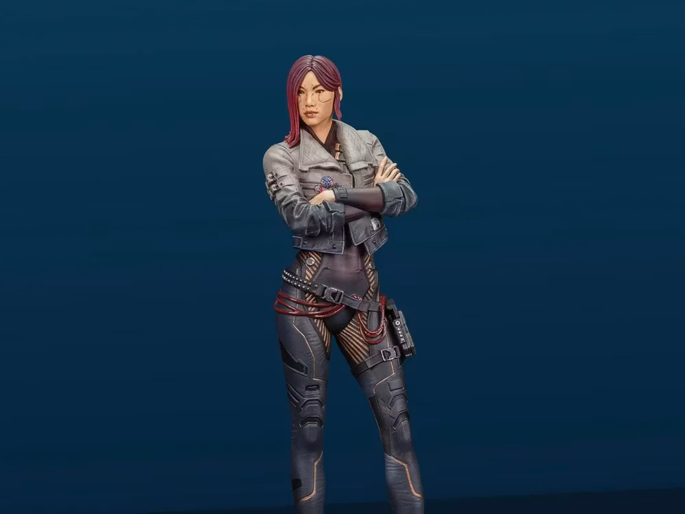 Standing at 9” tall atop an NUSA emblem base, this collectible captures Songbird’s signature look, featuring her denim jacket, holstered cyberdeck, and unique cyberware facial markings. This is the perfect companion to your Cyberpunk 2077: Solomon Reed figure (sold separately).