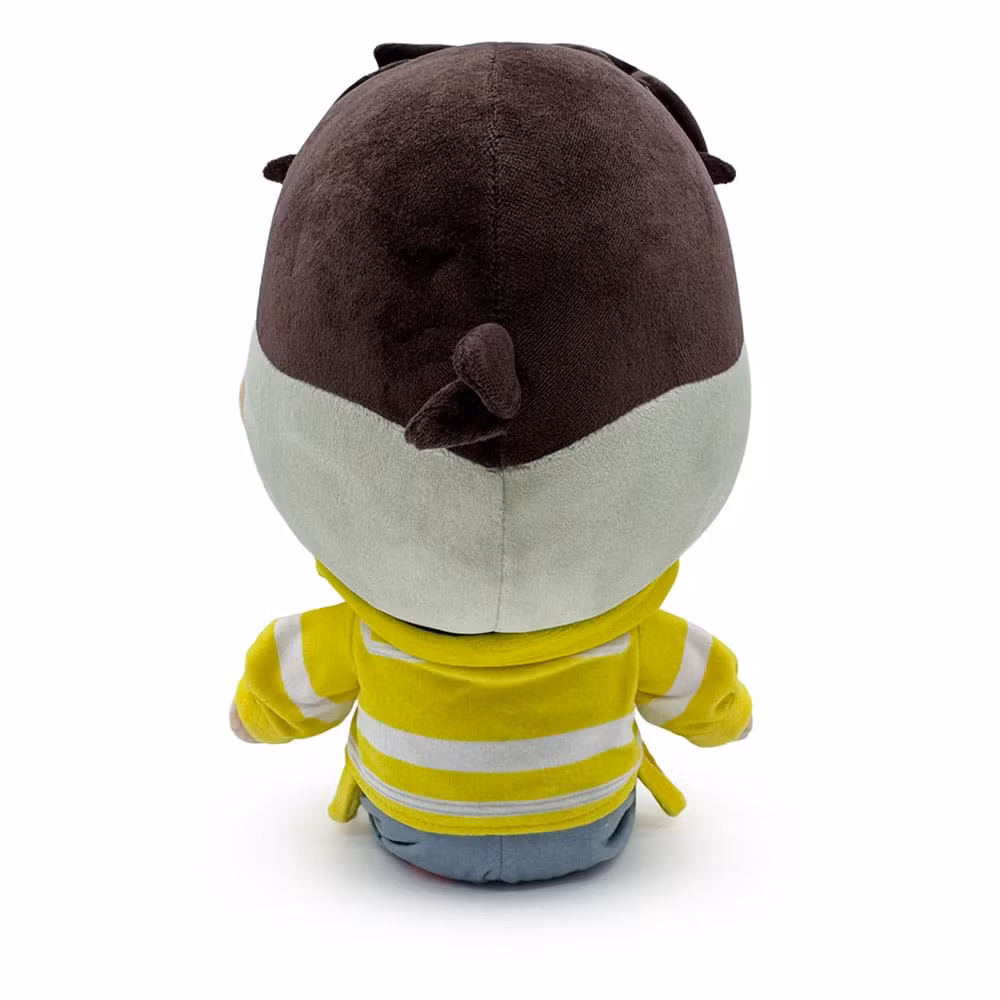 Watch out, Night City, David's got some new chrome! Well, it's more plush than chrome... Sitting at 9 inches tall with a thin frown and angled eyebrows resting over brown eyes, dark hair flicks up from his head as a streaked grey undercut covers the sides and back. With a golden cross hanging from his neck and wearing a yellow jacket with white patterns and a blue collar, turquoise stripes run down the sides of his blue pants to match his shoes. This plush is packed to the seams with 100% PP cotton and is made of the softest minky material with accents of felt, absolutely perfect for cuddling as the leader of your crew!