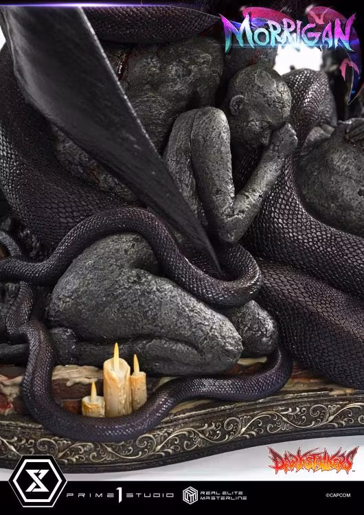 The custom gothic base features a coiled serpent rearing its head and petrified beings reduced to a throne imagery that evokes Morrigan’s power and allure. Even in stone, blood continues to flow, a symbol of endless pleasure and pain. Morrigan, now reborn with new allure.