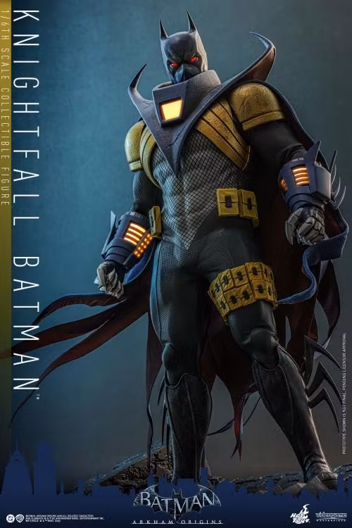 Hot Toys introducerar stolt Knightfall Batman-samlarfiguren™ i skala 1/6. Figuren visar en maskerad huvudskulptur med LED-ljusfunktion på ögonen, vilket förstärker den kusliga intensiteten i Batmans vigilante blick. Hans kostym är målad i djärva guld- och blåtoner, berikade med rustningsdelar som uppvisar stridssliten väderlek. Dräkten har ett LED-belyst stort axelpansar, samt LED-belysta handskar, som återskapar dräktens skrämmande teknik. Den häftiga silhuetten fulländas av hans blå och röda cape med ståltråd, medan de gula midje- och lårfickorna accentuerar den praktiska looken. För att dynamiskt posera och uttrycka sin grymhet innehåller figuren sex kloförsedda händer, var och en utformad för att ge liv åt hans hotfulla närvaro. Den levereras komplett med en fästbar änterhake och en snygg figurbas för att erbjuda dynamiska visningsalternativ.