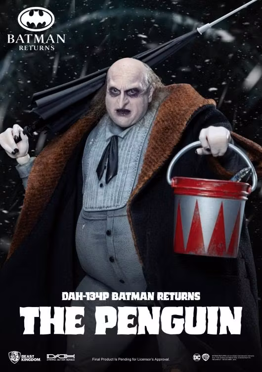Beast Kingdom presenterar stolt det senaste tillskottet i sin DAH-serie, DAH-134P Batman Returns The Penguin. Denna figur fångar troget Pingvinens mörka utseende från filmen. Huvudskulpturen framhäver ansiktsdetaljerna, rotat hår skapar hans rufsiga lockar och hudtexturen speglar hans unika uttryck. Kroppen speglar hans rundade kropp och signaturgrå kostym. Rocken, som är gjord av kvalitetstyg, har bruna sammetsliknande detaljer på krage och mudder, med detaljer som foder och fickor. Denna figur har 18 ledpunkter och inkluderar utbytbara händer, tillsammans med det karakteristiska paraplyet, en mini-vapeniserad pingvin, hinken, fisken och ett extra par händer.