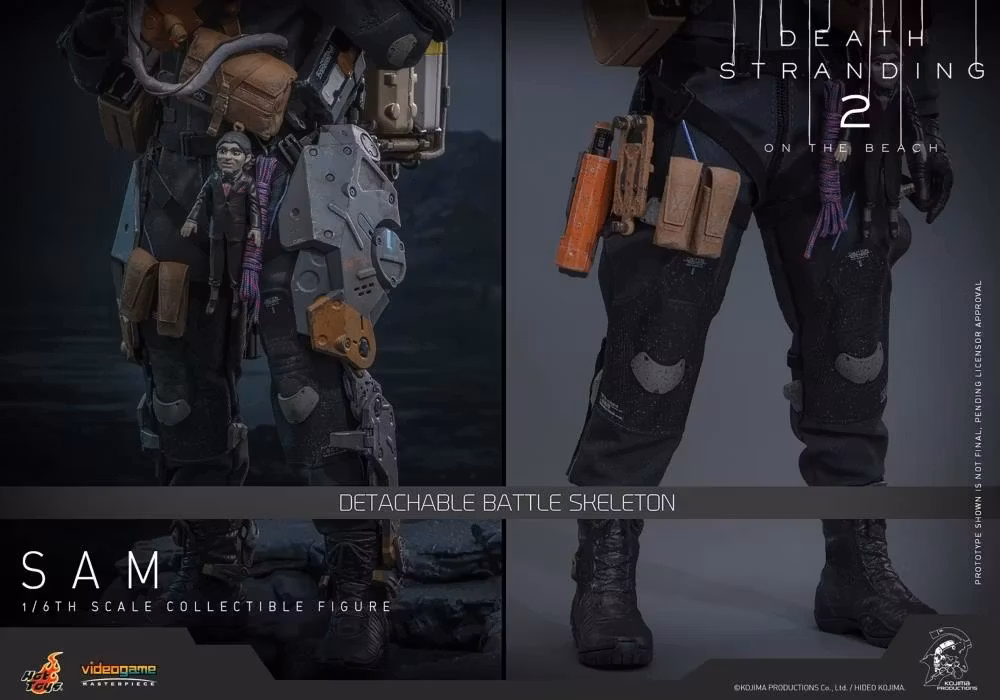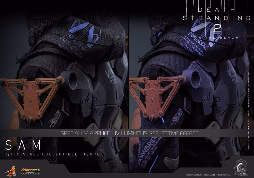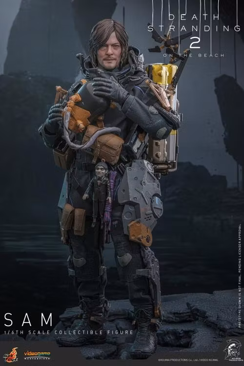 Hot Toys har äran att presentera samlarfiguren Sam Sixth Scale, som troget fångar Reedus likhet i spelet. Actionfiguren har ett nyskulpterat huvud med separata rullande ögonglober och en fint detaljerad mörkbrun hårskulptur. Hans Drawbridge-dräkt har en UV-lysande reflekterande effekt, kompletterad med en helkroppssele, ett avtagbart stridsskelett, ryggpansar med en Odradek-skanner och transportstövlar – allt väderbitet för autentisk, sliten realism. Utrustad med nio handskbeklädda händer är Sam redo för alla uppvisningsscenarier. Hans vapenarsenal består av en Strand, en maskinpistol, en LW Assault Rifle Lv2 och en hopvikt Blood Boomerang som kan fästas på hans sele.
