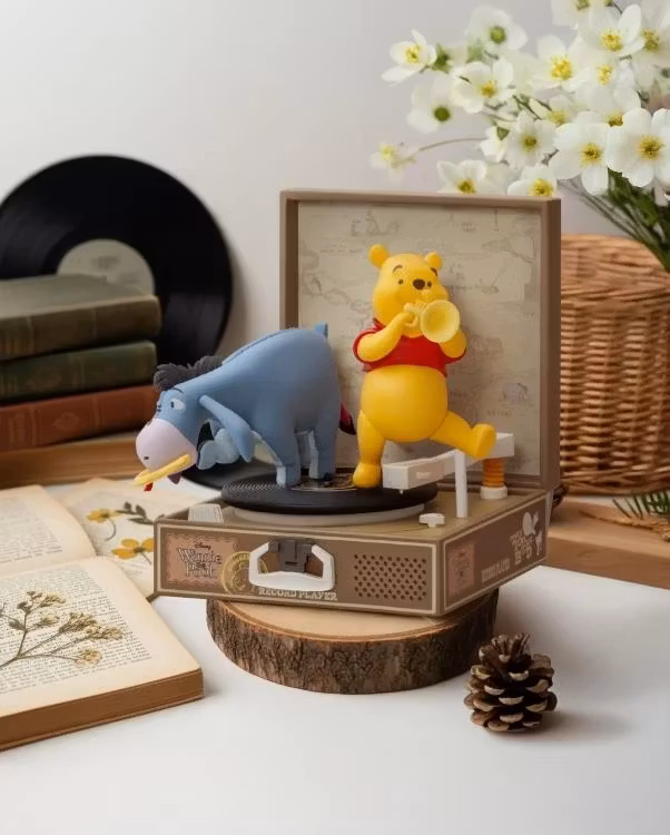 Inspirerad av en fridfull eftermiddagssamling i Hundra Tunnlands skog: Nalle Puh spelar glatt på sin lilla trumpet, medan Ior biter i en tamburin och håller rytmen med uppriktig hängivenhet. Tillsammans svajar de försiktigt ovanpå den roterande skivspelarplattformen.