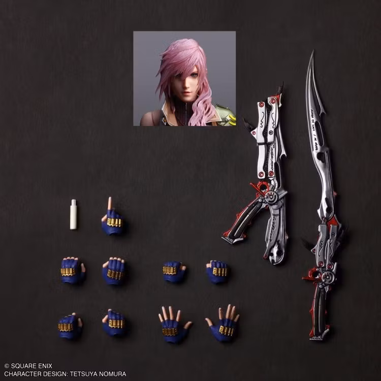 Accessories include Blaze Edge, a weapon symbolic of Lightning, which comes in two versions of both its gun form and sword form. In addition to the standard face, the figure comes with an interchangeable face part with moving eyes and various interchangeable hand parts, including those to hold the gun and the sword, allowing you to recreate various scenes from the game.