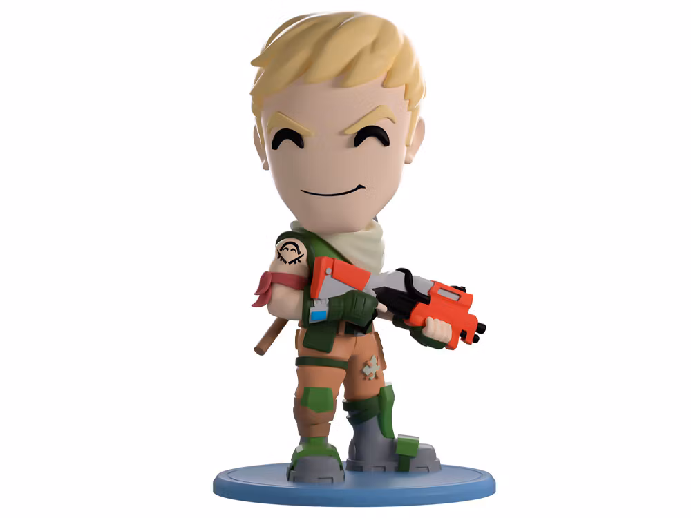 Jonesy has picked Youtooz for the ideal location to drop into battle! Standing at 4.9 inches tall and looking over his shoulder with a confident smirk crossing his face, short blonde hair sweeps forward as he holds a Legendary orange tactical shotgun to his front. Dressed in a sleeveless green top that shows off his muscular arms and the tattoo on his right shoulder, he wears brown pants that are covered in pockets along with sturdy boots that have green plates at their front and matching gloves.