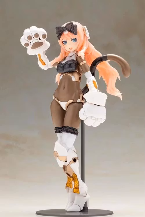 The popular Frame Arms Girl Durga I (Cat Armor Ver.) kit is reimagined as a variant in calico colors with the release of Frame Arms Girl Durga I (Cat Armor Ver. -Calico-)! Three pre-printed face parts unique from Frame Arms Girl Durga I (Cat Armor Ver.) are included (Daring/Looking Forward, Smiling/Looking Left, Winking/Looking Right). The arms and legs of the cat armor can be displayed with or without claws.
