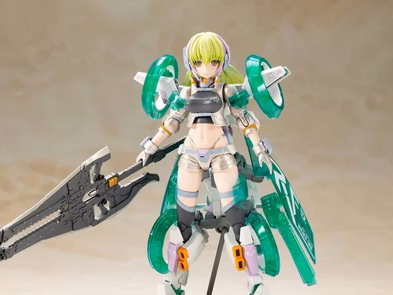 Frame Arms Girl Wilber Nine is a re-imagining of Kotobukiya sculptor Katsuhiko Hori's mecha design as an original female character illustrated by E-ji Komatsu. Additionally, this kit includes the Multi-Modular Blade (Official Deployment Type) designed by Niθ^ (Nishii) and featured in Hobby Japan's Girls Plamostyle. With bright colors made of clear parts, this model has motorcycle-esque markings and includes additional weapons.
