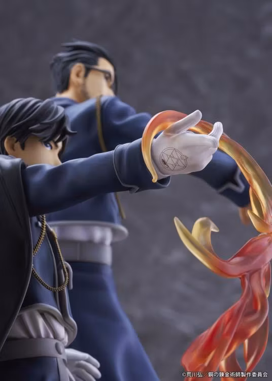 Från animeserien "Fullmetal Alchemist: Brotherhood" kommer en skalafigur med Roy Mustang och Maes Hughes. Roy Mustang och Maes Hughes har båda återskapats i figurform iklädda sina militära uniformer. Deras stridsklara poser står inför sina fiender och flameffektdelarna kombineras för att skapa en imponerande, kraftfull övergripande design.