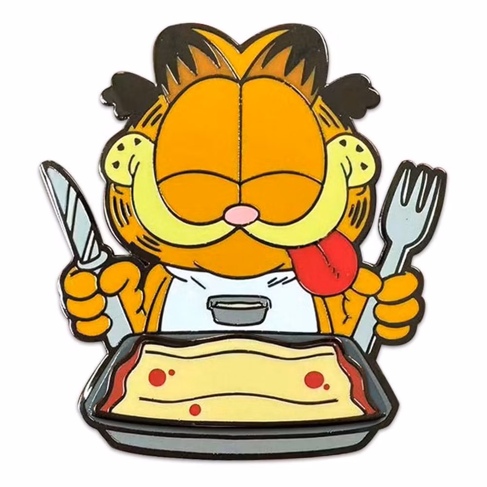 Suppers on and the first one at the table ready to eat is Garfield, as his favorite Lasagna is still steaming from the oven! This brand new 2 inch pin is made of high-quality enamel with a shiny finish and is designed to show Garfield looming over some fresh lasagna with his arms raised holding a knife and fork as a bib covers his chest. Under his very content face with and outstretched red tongue, the delicious lasagna is complete with a magnetic pasta topper that can be removed to an empty baking tin! This pin is perfect as decoration on a cork board or showing off on your tote bag, backpack, fanny pack, jacket or wherever your heart desires, these pins are sure to turn heads and catch the eyes of anyone you pass, letting them just who's a lasagna fiend!