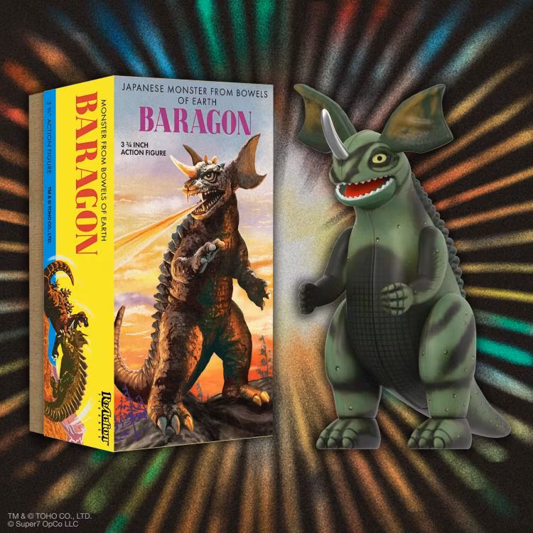 Rise, roar, and shine! Create a little kaiju chaos with retro tin toy-inspired Godzilla ReAction Figures. The Toho “Tin” figures of Godzilla and Baragon in this collection are inspired by the 1960s Godzilla Marusan tin toys of the past, which sparked imagination and a sense of wonder for children everywhere. These Super7 vinyl collectibles are intricately sculpted and painted. They stand at 3.75” tall and are articulated at the shoulders, hips, and tail—so you can pose them for display on your shelves—or re-create fierce battle scenes of monstrous proportions. Packaging for these collectibles features original Super7 artwork, inspired by the retro toy boxes of the 1960s. Grow your kaiju collection with a captivating blast from the past.