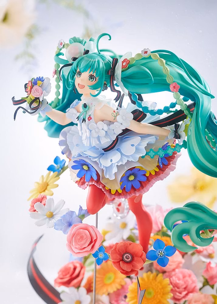 From Character Vocal Series 01: Hatsune Miku comes a 1/7 scale figure based on the main visual illustration from Hatsune Miku JAPAN LIVE TOUR 2025 ~BLOOMING~! This model beautifully captures the essence and mood of illustrator Mai Yoneyama's vibrant artwork. The detailed sculpting of the flowers and Miku's pose as she appears to jump right out of a bouquet are truly a sight to behold! As the tour theme BLOOMING suggests, this Hatsune Miku figure blossoms with charm and is sure to brighten your collection like a radiant flower.