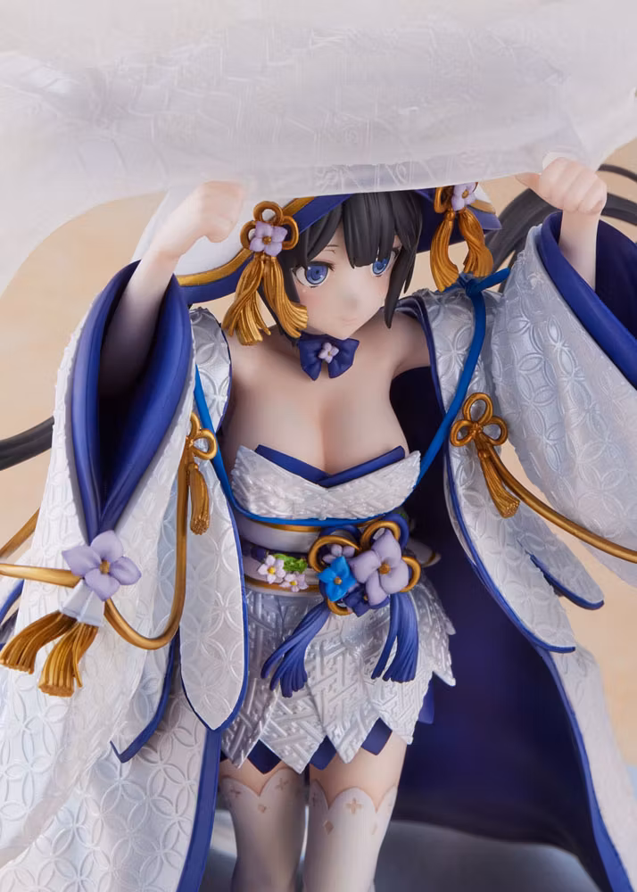 The delicate pattern on the surface of the fabric is expressed in a modeling The solid white color with blue in the image of Hestia everywhere expresses the pattern of the fabric in the form of modeling rather than painting or decals! The pure white uchikake and hanging are painted with a pale pearl coating, which changes its shine beautifully depending on the viewing angle. The floral pattern decorated on the uchikake and the gold color in various places further emphasize the beauty of pure white. Small items such as obi fastenings, tuft decorations, and ribbons were carefully made in detail. Beautiful and cute... No matter what angle you look at the figure.