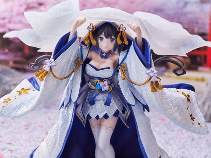 Please invite Hestia, who is full of happiness in pure white. Hestia with a gentle, smiling expression and has big eyes, a slight blush on her cheeks, and a cute smile. The twin tails that flutter in the wind are also expressed in the model. The absolute area peeking out from the pure white is a must-see! Pure white and transparent beautiful coat (katsugi) and covering the head with a transparent coat (katsugi), the figure is finished beautifully.