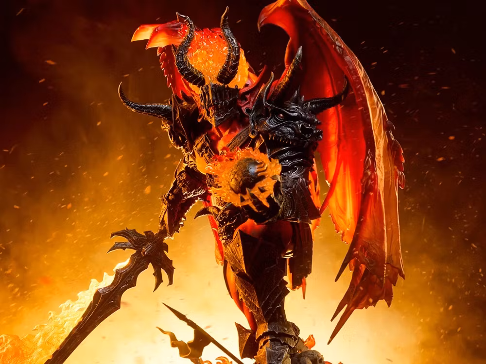 The Arethyr: War Statue measures 20.6” tall x 23.44” wide x 13.3” deep, capturing this hellion’s hunger for battle. The warmonger brandishes the flaming Aetherblade sword as he storms over a field of broken armaments and fallen fighters. His devilish form exudes brute strength, with leathery wings poised to unfurl. Arethyr is protected by wicked black armor forged in the ruthless fires of conflict, with monstrous horned pauldrons on either shoulder and a matching belt ornament across his waist. His grimacing portrait is guarded by a cage-like mask, crowned with a blazing tongue of fire.