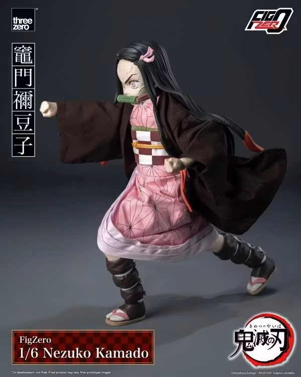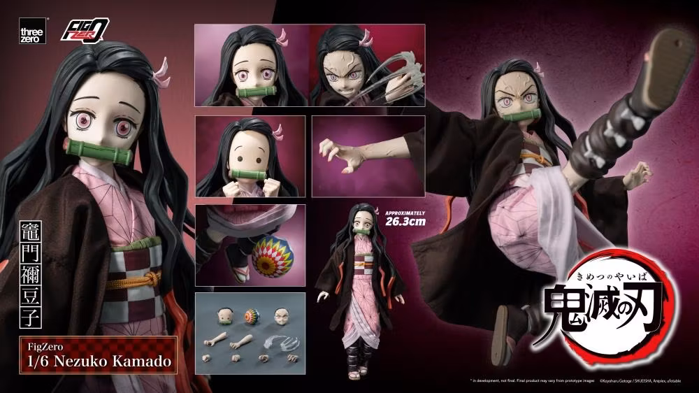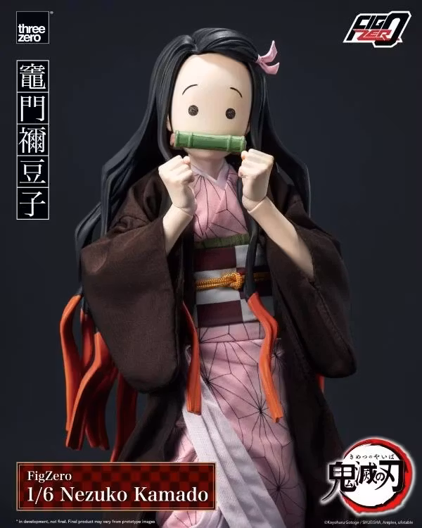 Samlarfiguren FigZero 1/6 Nezuko Kamado är cirka 26,3 cm (10,4 tum) hög och har cirka 34 artikulationspunkter. Nezuko är klädd i en kimono tillverkad av threezeros utsökta tyghantverk. Den delikata rosa kimonon är prydd med Asanoha-mönster (hampablad), kompletterade med ett obibälte, en obijime och en obiage. Den är toppad med en mörkbrun haori och ihopparad med kyahan (leggings) och tabi strumpor med zori (sandaler), vilket perfekt återskapar hennes ikoniska utseende sett från animen.