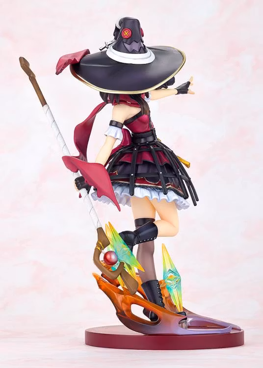 A figure of Megumin based on an original illustration by Kurone Mishima is here to celebrate the 10th anniversary of the popular KonoSuba: God's Blessing on This Wonderful World! series! Megumin is clad in an outfit consisting of a wine-red dress full of laces and belts as she strikes a confident expression while cool sparkling magic effects swirl around! Chomusuke, her friendly familiar, has also been recreated and exudes excitement! Although it is only about 18 cm tall, Megumin's charm has been condensed into the spectacular design and paint job of this 1/7 scale figure. Its size makes it easy to hold and display, so you can display it on your desk or bookshelves. We also recommend displaying it alongside volumes of the KonoSuba light novel series!