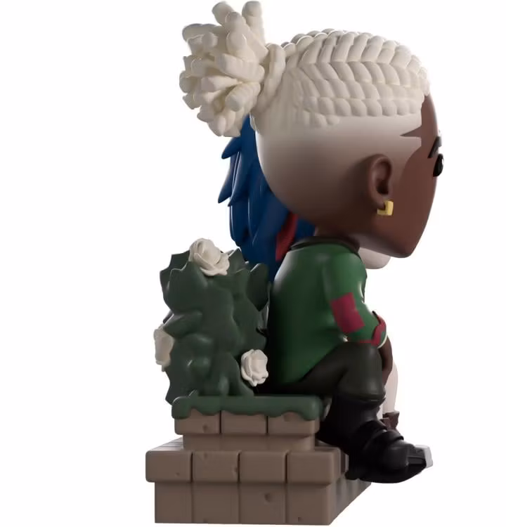 Ekko’s changed the timeline so he and Powder could spend a few extra moments together at Yotuooz! At 4.6 inches tall, this scene sees Ekko and Powder sitting atop stone steps with flowering bushes in the background as they gently rest their heads and hands together to share a soft moment. With gentle smiles, as they enjoy just being together, Ekko looks off to the side as his light braided hair is tied at the back and he wears a two-tone green suit over a pale white shirt, while Powder’s messy blue fringe sits over pink and blue eyes as she wears a cropped black and maroon jacket over her cream colored dress.