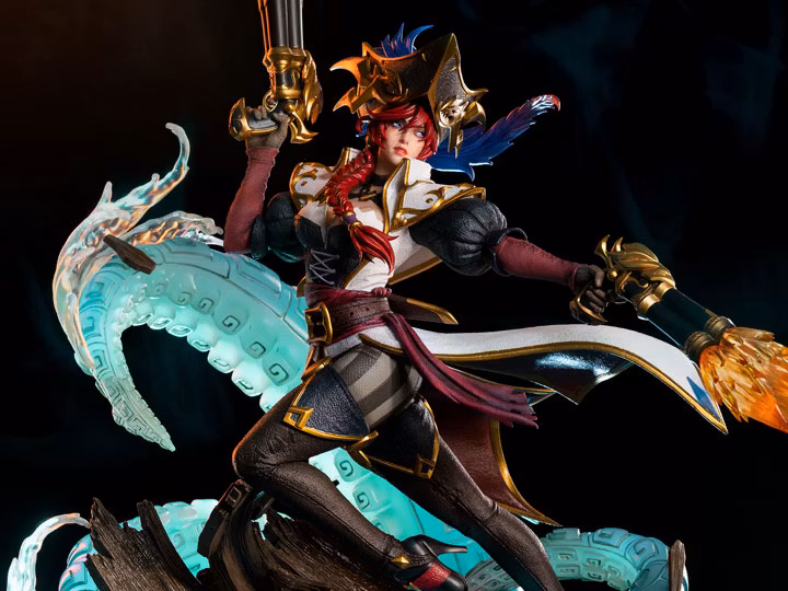 Known for her beauty, but standing for ruthlessness, Sarah is a Bilgewater sea captain who has created an image not to be taken lightly by the port town's hardened crime syndicate, who also call her - Miss Doom. When she was a child, she witnessed the murder of her family by the pirate king, GangPlanck. Years later she brutally avenged the murder by blowing him and his flagship up along with his men and ship. All who underestimate her find themselves facing a deceptively cunning opponent and the possibility of having to deal with a bullet or two in their stomach. With LED light function. It measures approx. 65 x 36 x 50 cm and comes in a printed box. Limited to 599 pieces worldwide.