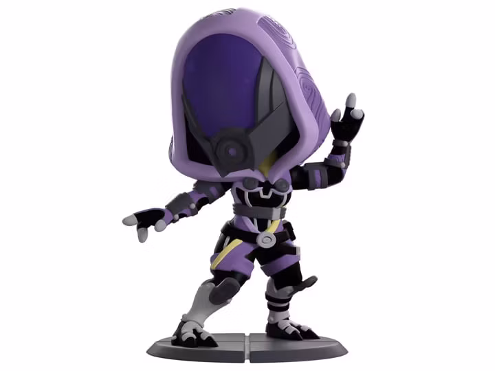 Vi är i behov av några desperata mekaniska reparationer och Tali har anlänt för att hjälpa oss att komma igång igen med sin Youtooz-debut! Hon är 4,3 tum lång med armarna utsträckta när hon pekar en 3-fingrad hand mot himlen, hennes ansikte är täckt av ett långt lila visir när hennes hjälm böjer sig framåt till ett cirkulärt munstycke. Med en tjock lila huva prydd med virvlande mönster draperad över huvudet som löper ner över kroppen för att svepa runt midjan och låren, bär hon ett svart bälte runt midjan eftersom en dolk är fastspänd på sidan av hennes vita känga.