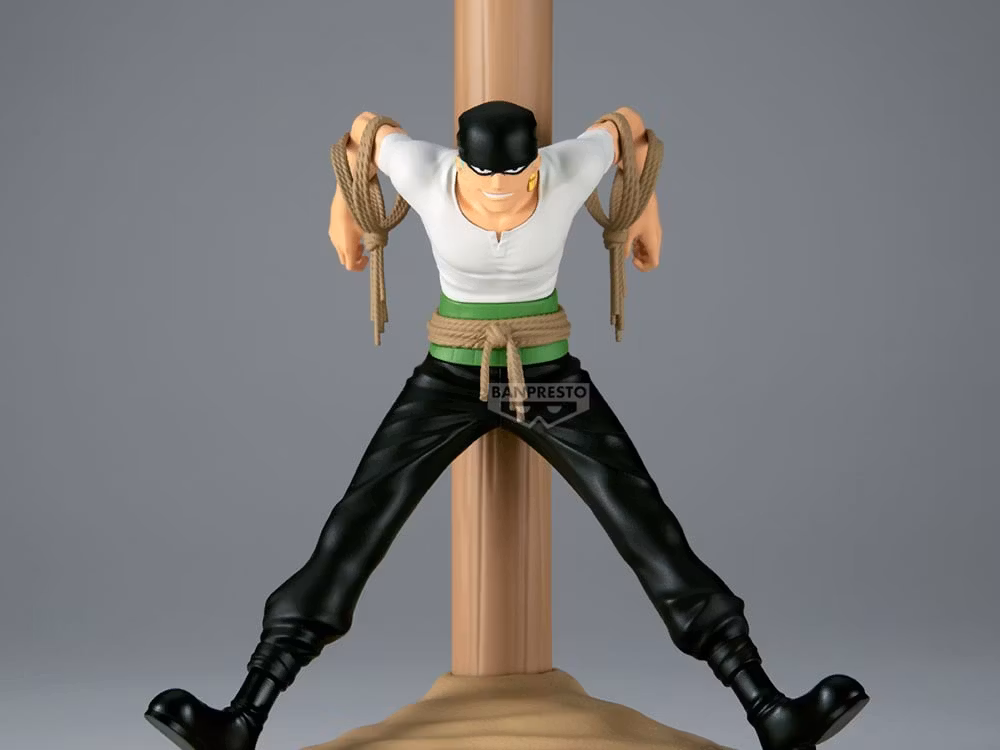 Banpresto is setting sail in search of the One Piece and has picked up a new crewmate to join in the adventure: the swordsman of the Straw Hat Pirates, Roronoa Zoro! Depicted tied to a mast in preparation of being executed for saving a little girl from a corrupted captain's pet wolf, Zoro nevertheless has a determined grin on his face as he faces down the Marines. Don't miss out on growing your One Piece collection and add this awesome figure to your collection today!