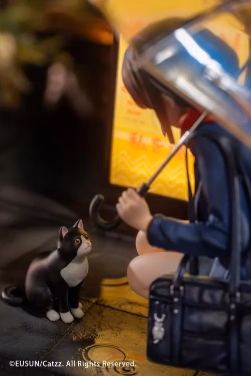 Under the production of EUSUN, popular illustrator Catzz's original work Encounter in the rain is now available as a 1/7 scale figure! The story begins on a rainy night — a girl holding an umbrella looks into the eyes of a small black cat. The base with USB LED light function makes the world of work even more fantastic. As a pre-order bonus, a rose and an unpainted cat figure are included. Make sure not to miss out!