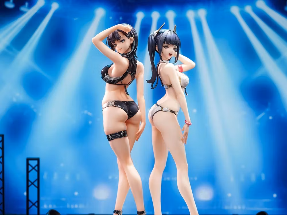 Hakuyou Maruko makes her appearance with a lively pose - her pure white swimsuit and bouncing twin-tails shine brilliantly under the light, while her face beams with a playful, cheerful expression. Following her is Konno Aoi, exuding an air of maturity and composure. She gazes confidently at her audience, and her dark swimsuit perfectly highlights her graceful pose. Together, the two girls create an irresistibly captivating scene on stage.