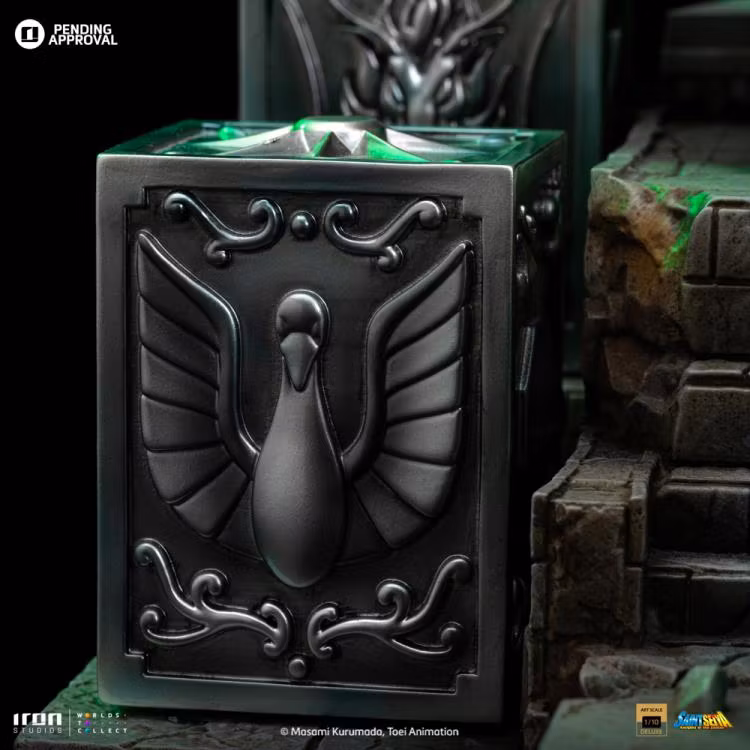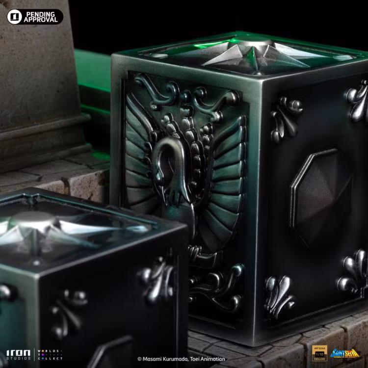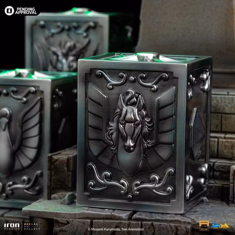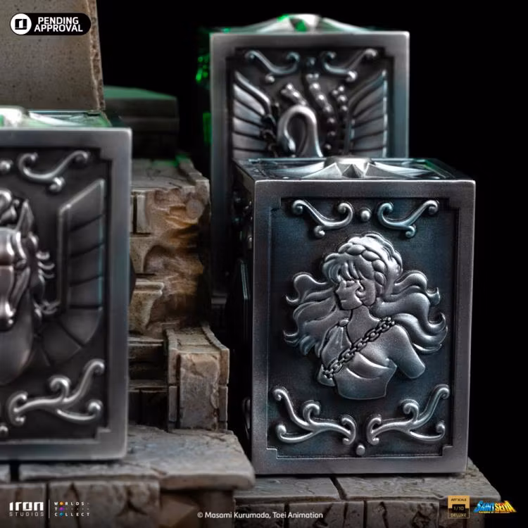 Pandora lådor av brons heliga Pegasus, Cygnus, Dragon, Andromeda och Phoenix, som innehåller respektive kraftfulla tyger, för de fem hjälteförsvararna av gudinnan Athena som återföds för att skydda världen under 1900-talet. Iron Studios presenterar stolt den exklusiva statyn "Saori Kiddo Deluxe - Saint Seiya - Art Scale