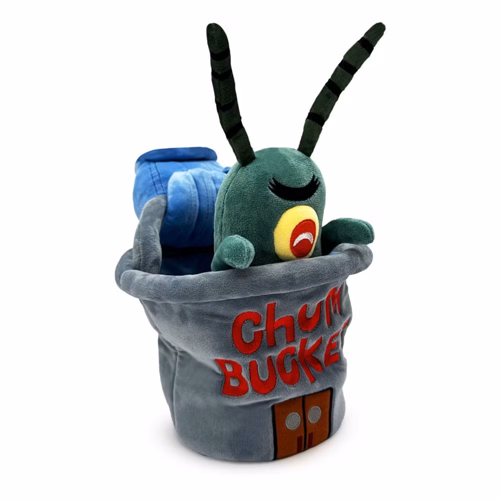 Det ser ut som om det finns en fin ny restaurang i kvarteret, och Youtooz är redo att äta! Denna perfekta representation av Planktons restaurang är 9 tum hög och är en enkel grå hink med Chum Bucket skrivet grovt i rött över framsidan ovanför en trädörr, medan en stor lila näve håller i det tunna handtaget som sträcker sig över toppen. Plankton är alltid på jakt efter alla möjligheter, men kikar över hinkens brätte med sitt unika röda och gula öga när han längtansfullt stirrar ut med ett par antenner som sträcker sig uppåt. Denna plysch är packad till sömmarna med 100% PP bomull och är gjord av det mjukaste minkymaterialet, helt perfekt för att gosa eller hjälpa till att stjäla recept!