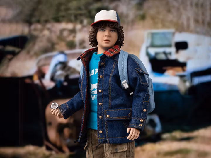 The Stranger Things - 1/6 Dustin Henderson collectible figure stands approximately 9.2 inches (~23cm) tall and features a fully-articulated original body with 28 points of articulation and fabric clothing. The highly-detailed figure includes one head sculpt with an authentic likeness to the character's appearance in the hit Netflix series Stranger Things. Accessories include a watch, compass, headset, walkie-talkie, flashlight, potato chip container, backpack, D'Art (stage 2), and four pairs of interchangeable hands.