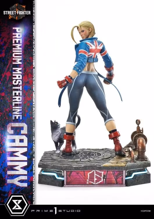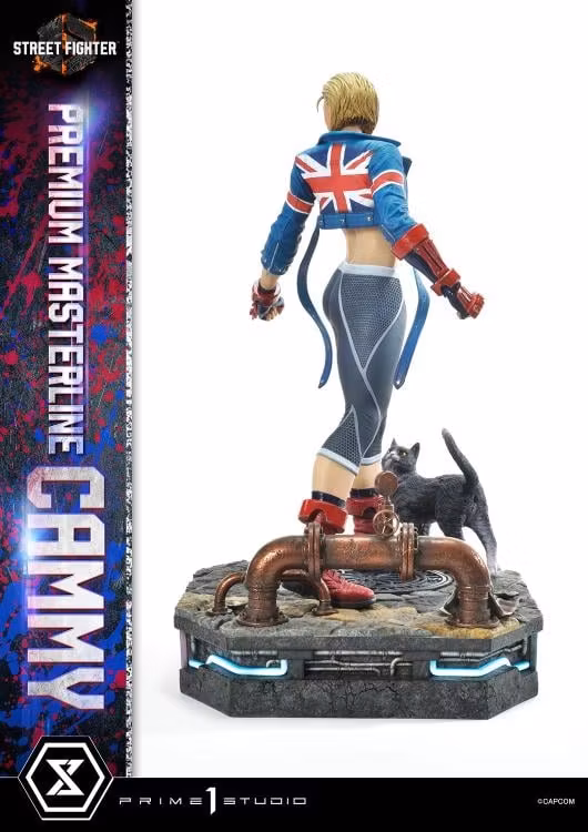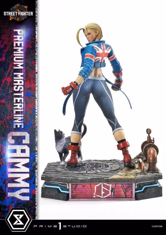 Cammy är minutiöst utformad i sin helt nya look, med sin nya civila outfit, borta är den ikoniska trikån, hon bär nu en ljust beskuren blå jacka med Union Jack, Storbritanniens flagga målad på ryggen, och en mittriff- avslöjad crop top och tighta, stretchiga träningsleggings, fortfarande redo för strid om behovet uppstår, som representerat med hennes röda handskar. Som alltid går våra skulptörer och målare mycket långt för att strukturera och måla varje tum perfekt. Basen har Storbritanniens kullerstensgator, med LED-belysning - och låt oss inte glömma Cammys katt, som alltid verkar lurar runt efter varje seger!