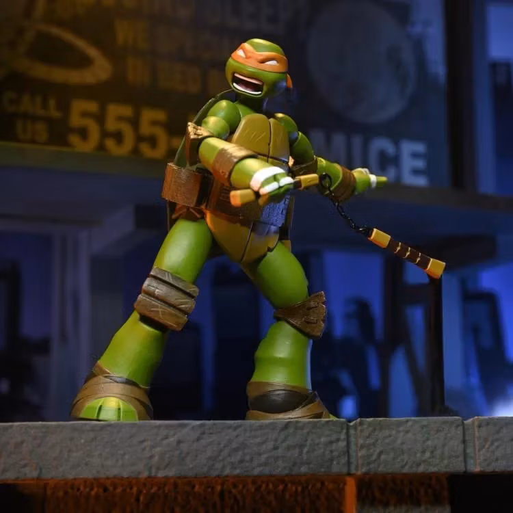 Booyakasha! NECA is proud to present all-new Ultimate action figures from Nickelodeon's hit 2012 Teenage Mutant Ninja Turtles animated series! Known for its dynamic animation style and character-driven storytelling, the acclaimed show reimagined the heroes in a half shell for a new generation. This 7-inch scale Michelangelo figure captures the fun-loving turtle with incredible painted details to replicate his animated appearance. He includes an array of episode-specific accessories: interchangeable heads and hands, nunchucks and kusarigama, pizza slice, smoke bomb, Turtlecom, and fan-favorite Ice Cream Kitty. The figure comes in collector-friendly packaging with illustrations by TMNT artist Ciro Nieli.