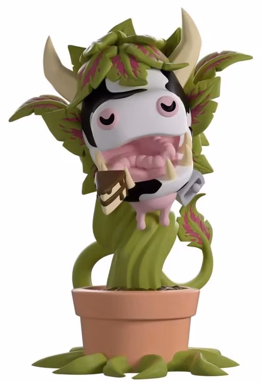 Nothing says a healthy balanced diet like eating the Cow plant, before it eats you! At 4.9 inches tall, this figure showcases the iconic Cow plant growing from within an earthen pot as lush green roots extend from its base. With the stem of the plant reaches for the sky and a black and white cow head protruding from green and red leaves, a cake tipped tongue hangs from their open mouth.