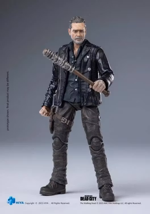 Introducing the new EXQUISITE MINI Series Negan, a 1/18 scale action figure from The Walking Dead: Dead City, by Hiya Toys! Premiering in June 2023, the sequel series reveals Negan as a wanted man for killing law enforcement officers and four others. Despite Negan's reluctance to get involved in more trouble, reality forces him to reveal his radical side. While attempting to seek redemption through righteous actions, he often succumbs to extreme violence when faced with perceived threats. The 1/18 scale EXQUISITE MINI series Negan action figure comes dressed in a leather jacket and comes equipped with an iron pipe and his iconic barbed wire wrapped baseball bat, Lucille. The figure includes 2 interchangeable hands, and with 15 joints, it features extensive articulation for recreating action poses. Additionally, each figure comes with a randomly selected exclusive stand from four different appearances, replicating scenes of scattered bodies and muddy grounds, providing an immersive experience of the thrilling bloodbath!