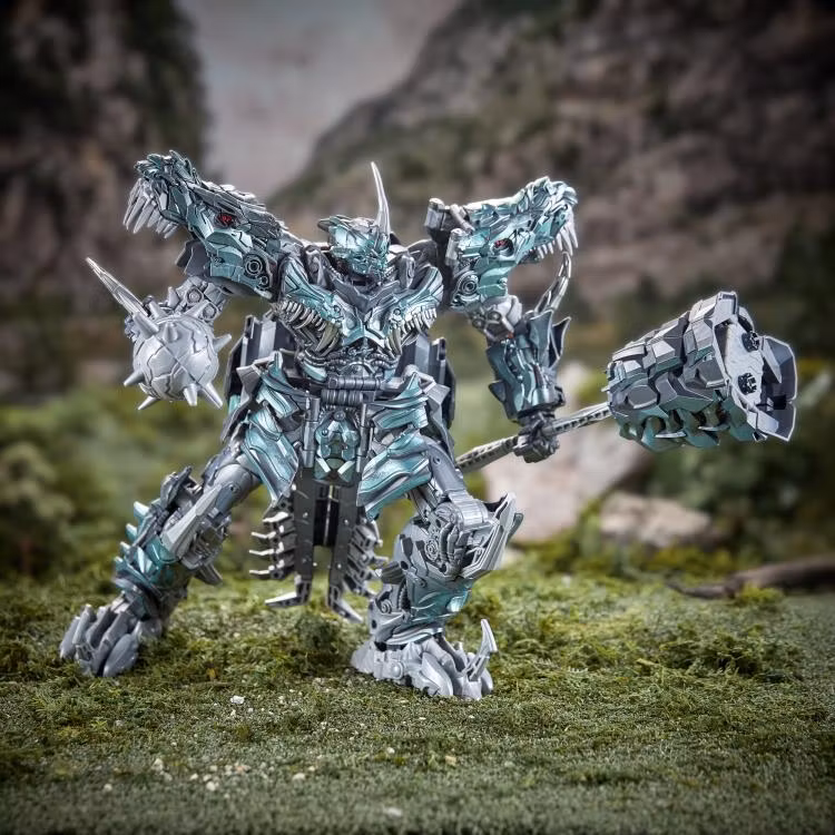This massive 15-inch (38 cm) figure converts from robot to dinosaur mode in 59 steps. With movie-inspired details, intricate poseability, and attachable accessories like a mace and spiked knuckle, this Grimlock action figure makes an awesome addition to any Transformers collection.