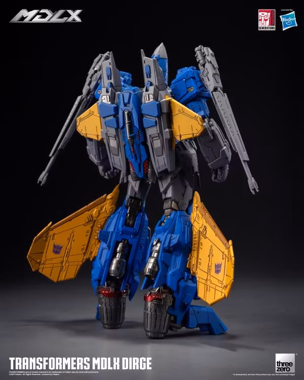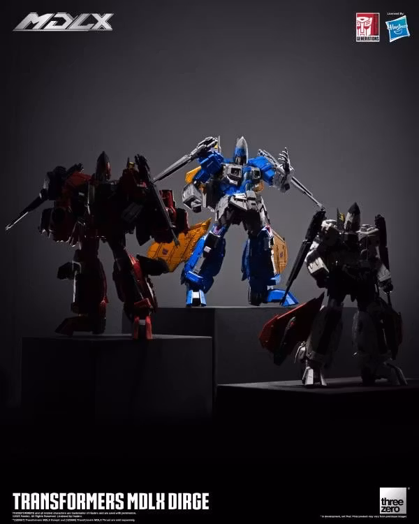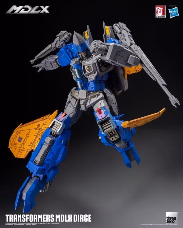 MDLX Dirge är cirka 7,8 (20 cm) hög, med cirka 50 artikulationspunkter. threezero Art Director Kelvin Sau gör om den här Decepticon Seeker Warrior. MDLX Dirge har en ny huvudskulptur, färgapplikationer, panelfoder och anpassade vingar på ryggen och benen. Den här figuren har en hyperdetaljerad mekanisk estetik och använder threezeros unika pressgjutna zinklegering och ramsystem av teknisk kvalitet, vilket förbättrar figurens taktila spelbarhet och hållbarhet.