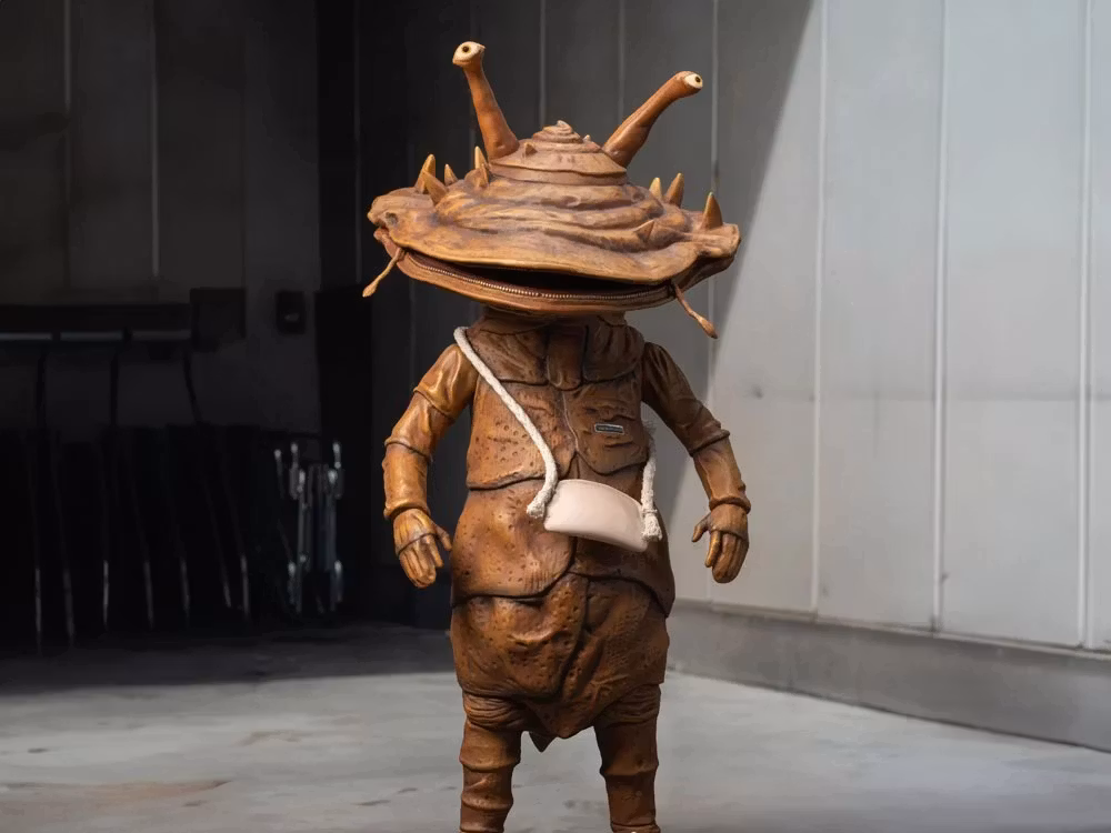 Kanegon’s head is in the shape of a coin purse, while his body is like a Martian. His eyes pop out to the direction of money, his mouth is a zipper of a wallet, his tail is rugged like Godzilla, his thorns on his head are there to make him look strong, and his body shines like coins. Since Kanegon was a human before the transformation, he speaks the same language (Japanese) as humans.