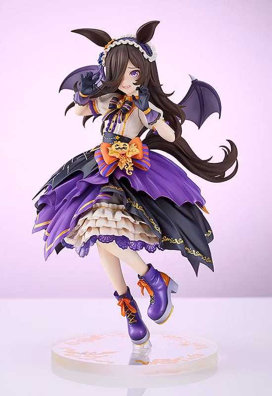 Rice Shower from Umamusume: Pretty Derby joins the game's figure lineup at 1/7 scale, wearing her Vampire Makeover! outfit! Rice Shower's lovable appearance, looking slightly embarrassed as she does her best vampire impression, has been faithfully captured with stunningly detailed sculpting. Her voluminous, layered dress with Halloween-colored frills features a slightly different look from every angle. Delicate textures, such as the translucent lace of her gloves and skirt, as well as the gold and pearl decorations throughout her outfit are sure to catch your eye. Be sure to add this charming Halloween-themed figure of Rice Shower to your collection!