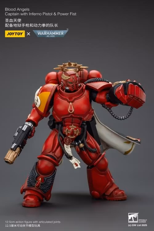 Lead your Blood Angels to glory with this highly detailed 1/18 scale action figure of the Captain, armed with a blazing Inferno Pistol and a crushing Power Fist. Crafted by JoyToy in collaboration with Games Workshop, this figure captures the fierce nobility and battle-ready stance of the Blood Angels Chapter. Perfect for display or dynamic posing on the battlefield!