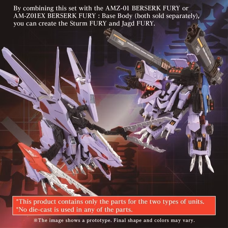 Från Takara Tomy och Zoids-serien kommer Zoids Adamas Machina AM-Z01CP Berserk Fury Sturm & Jagd Unit tillbehörsset, som kan kombineras med antingen AMZ-01 Berserk Fury (säljs separat) eller AM-Z01EX Berserk Fury (Elementary Body) (säljs separat) för att återskapa Sturm Fury och Jagd Fury. Jagd Unit realiseras i 3D för första gången.