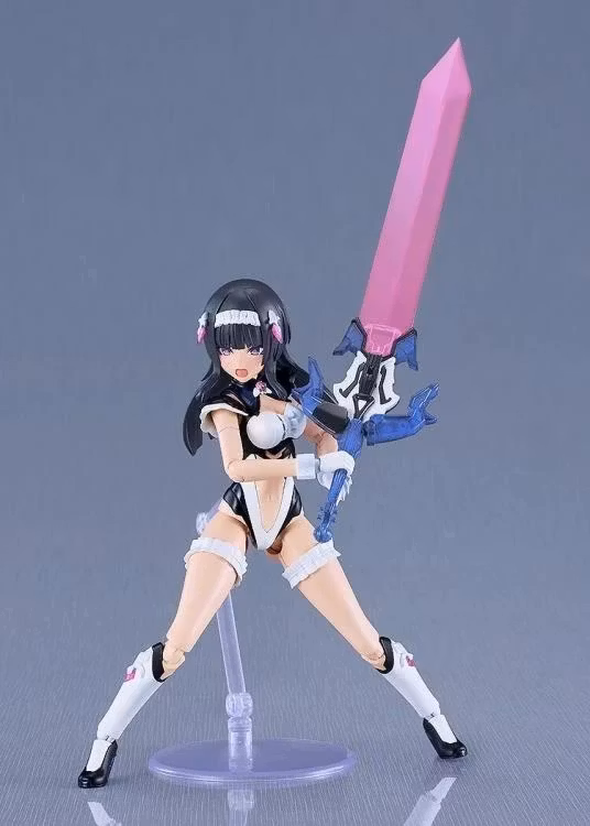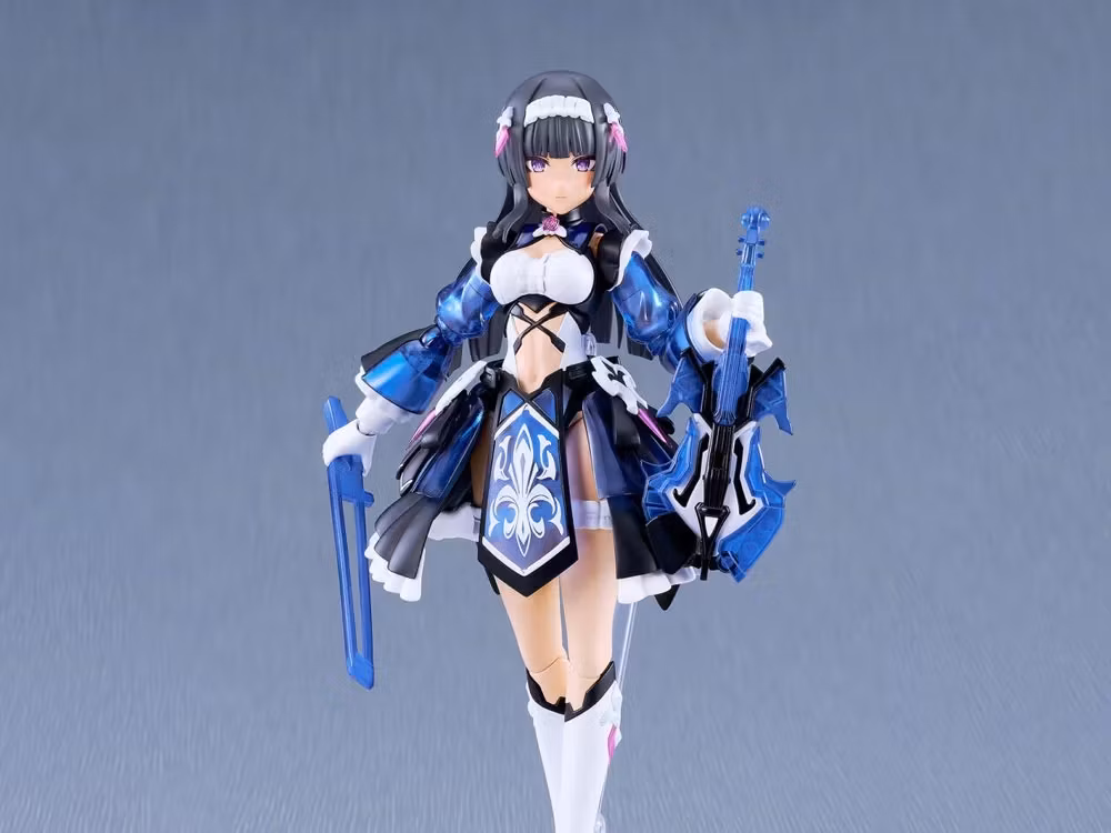 The model stands at about 160mm in height and parts are separated into colored runners, with the model featuring various points of articulation once fully assembled. Four pre-painted face plates and four blank face plates with decals for customizing expressions are included. Translucent parts are used in blue areas of the main body and weapons. A violin type Harmonic Weapon is included, and can be transformed from Instrument Mode to Bowgun mode. Armaments can also be reassembled to transform into a large blade. Frills on the skirt and arms can be removed, and the model can be displayed in high-speed light equipment mode by rearranging certain parts.