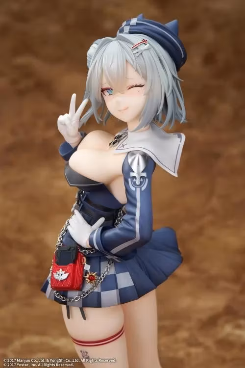 Her playful pose as she winks and gives a peace sign, her stylish bodyline, and the chic uniform design unique to the Iron Blood camp are all beautifully recreated. The boldly open chest and fluttering skirt, as well as accessories such as the pouch and chain on her waist, have been precisely sculpted, resulting in a perfect finish down to the last detail.