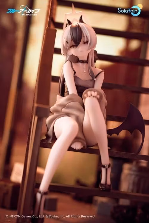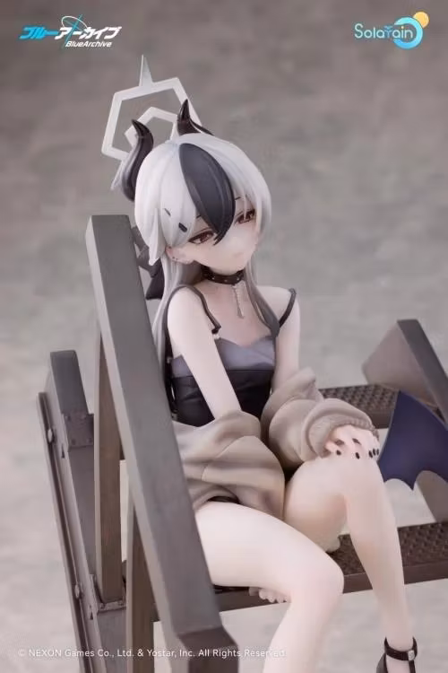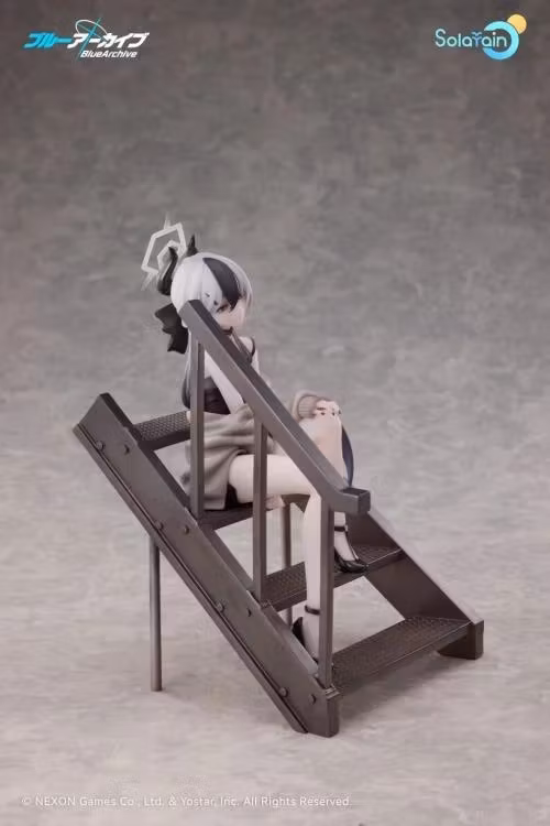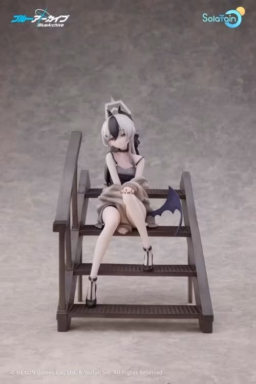 From the popular game Blue Archive comes a 1/7 scale figure of Kayoko, a member of Handy Solver 68! The figure features Kayoko with her long monochromatic hair tied up with a black ribbon, and a black-and-gray camisole dress that shows off her delicate physique. Kayoko's simple yet sophisticated attire accentuates her calm and composed personality. The special staircase base evokes a moment spent with Sensei in the memorial lobby, with the sunset behind. Sitting atop the stairs with her hands on her knees, the figure is based on Kayoko in a relaxed pose. Details such as her half-worn cardigan and soft purple wing are also included. Her gentle expression is captivates whoever lays their eyes on her, with a hint of playfulness. The mole on her collarbone, her earrings, choker and her black nails have all been carefully brought to life in figure form. Her mature charm is apparent in every detail. A smiling face part is also included for a different display option. Enjoy seeing different sides of Kayoko with the use of the interchangeable face part. Be sure to add this figure of Kayoko to your collection.