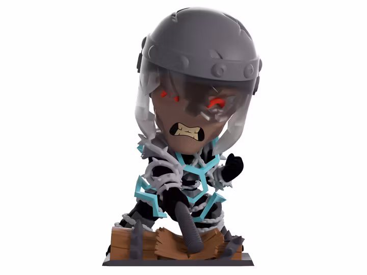 You better watch out because Brutus has smashed his way into Youtooz to hunt down any survivors! Oh and his debut of course! Standing at 4.6 inches tall and throwing his body forward as he slams a thick metal bar into the spiked barrel at his feet, he clenches his dirty yellow teeth as bright red eyes shine through the broken visor of his metal riot helmet. With a streak of jagged blue electricity curling around his body, his black outfit is covered in thick metal plates as chains and barbed wire wrap around his arms, legs and chest.