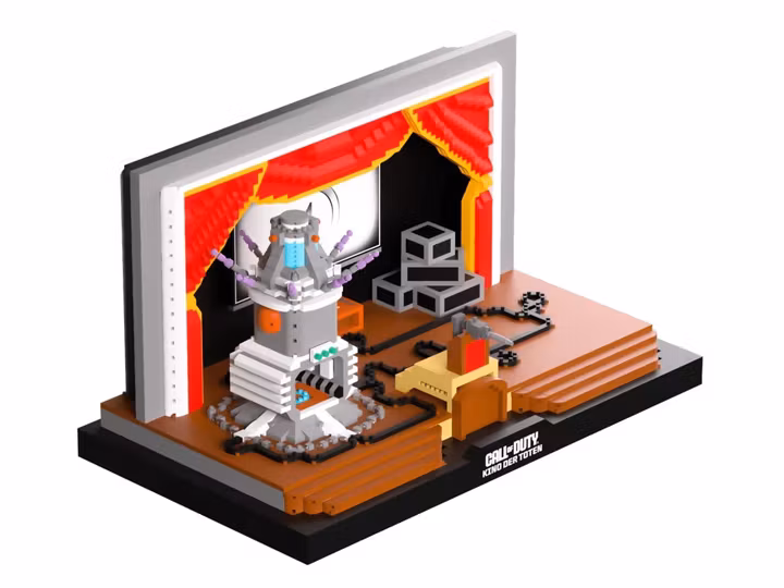 Nu kör vi! Är du redo att slåss dig igenom våg efter våg av zombies, ett block i taget, med denna skickligt utformade tegelsten av Kino Der Toten från Call of Duty! Med ett tungt rött och gult draperi draget undan och avslöjar en projektorduk och en mystisk låda med en liten nalle, där tunga lådor ligger bortkastade vid sidan, vilar en monterad kulspruta på podiet längst fram på den bruna scenen medan svarta kablar löper över dess yta till den höga grå Matter Transference Device som har vita åsar och orange orber på sidorna samt bleka lila stavar runt den genomskinliga blå kärnan högst upp. Bestående av 3479 delar och med måtten 20 x 34 x 20 cm och en expertskriven instruktionsbok som hjälper dig att bygga ditt alldeles egna Call of Duty-verk, är denna tegelsten den perfekta bakgrunden för din Call of Duty-Youtooz eller någon annan som överlevt varje våg!